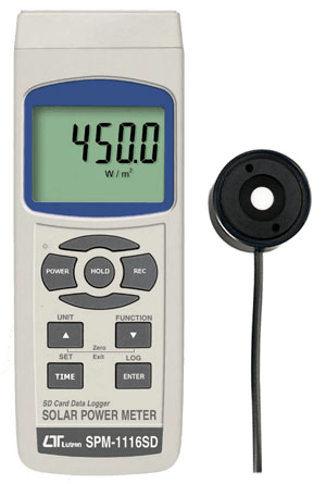 سولارمتر دستگاهی است که به صورت پرتابل بوده و می تواند انرژی خورشید یا نور خورشید را در واحد وات بر متر مربع اندازه گیری کند. سولارمترها می توانند پیرانومتر هایی که برای اندازه گیری چگالی شار تابش خورشیدی یا هر وسیله ای که برای اندازه گیری تولید کیلووات ساعت از یک سیستم فتتولتائیگ استفاده می کند را نمایش دهد.