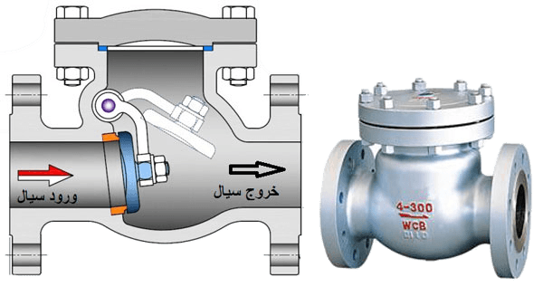 در شیر یک طرفه لولایی یا دریچه ای (Swing Check Valve)، دیسک با پین به صورت عمودی به بدنه لولا می شود. با فشار سیال دیسک تا 180 درجه در جهت ورودی بالا می رود و سیال را عبور می دهد، در ادامه با افت فشار سیال و تغییر مسیر برگشت سیال، دیسک پایین آمده و مانع برگشتن سیال می گردد. تلاطم و آشفتگی در چک ولو دریچه ای بسیار کم بوده و معمولا در طراحی خطوط پایپینگ (Piping) همراه با گیت ولو (شیر دروازه ای) و شیر خودکار یا شیر یکطرفه دریچه ای (یک طرفه نوسانی) استفاده می شود. می توان این شیرها را هم به صورت افقی و هم عمودی نصب کرد. توصیه می شود در خطوطی که سیال دارای تلاطم و آشفتگی بوده و ممکن است با ضربه های ایجاد شده (ضربه قوچی) به دیسک و متعلقات شیر آسیبی به آن وارد شود، از این شیر استفاده نگردد.