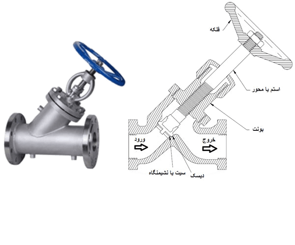 شیر کروی Y شکل که در آنها استم و دیسک نسبت به نشیمنگاه تقریبا 45 درجه زاویه دارد. از مزیت های این شیر، ضریب جریان بالا و همچنین افت فشار کم می باشد، که سیال با زاویه کمتری نسبت به شیر کروی Z شکل وارد شود و به همین نسبت با چرخش کمتری سیال خروج می کند، که این امر افت فشار کمتری نسبت به حالت قبلی دارد. به همین دلیل پیشنهاد می شود در خطوط پایپینگ که نیاز به باز بودن مداوم شیر است، از شیر کروی (شیر بشقابی) Y شکل استفاده شود.